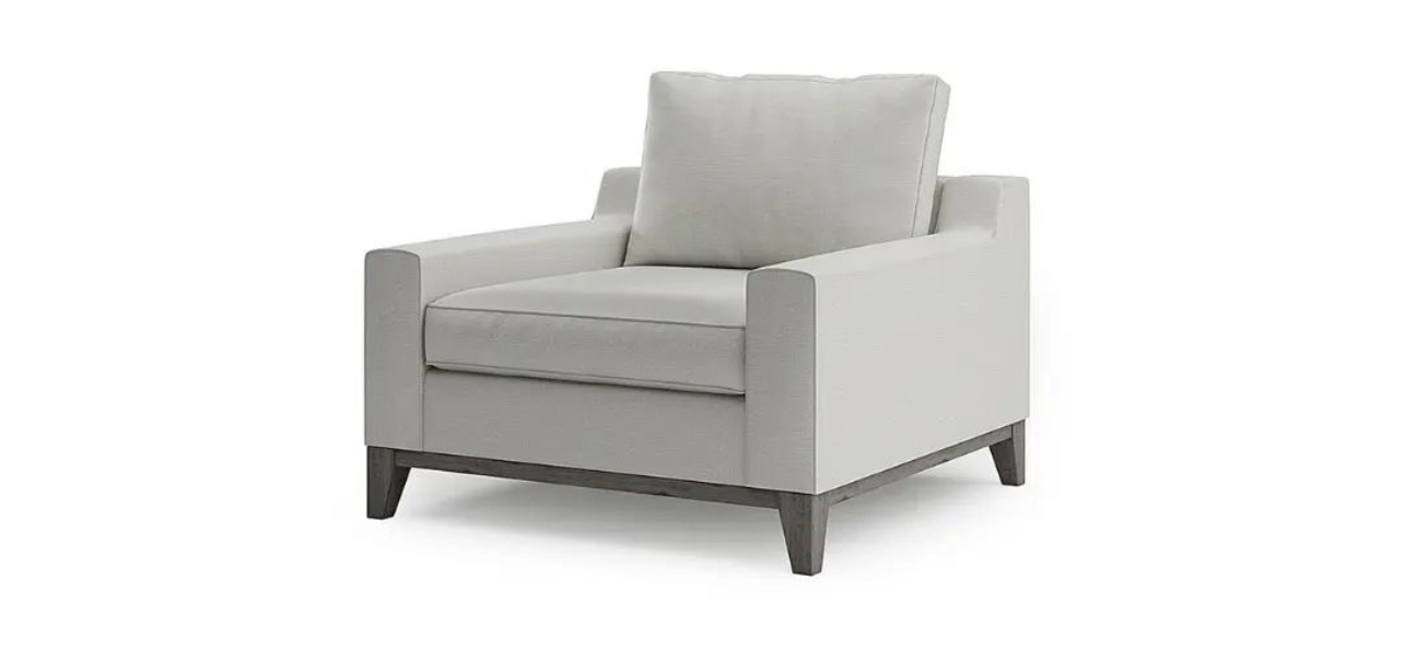 Fotel w eleganckim, nowoczesnym stylu, tapicerowany jasnoszarym kolorem. Ma szerokie podłokietniki, miękką poduchę oparciową oraz grube siedzisko dla komfortu użytkowania. Stoi na solidnych, drewnianych nogach w ciemnym kolorze, co dodaje mu elegancji i stabilności. Idealny do salonu lub pokoju wypoczynkowego.