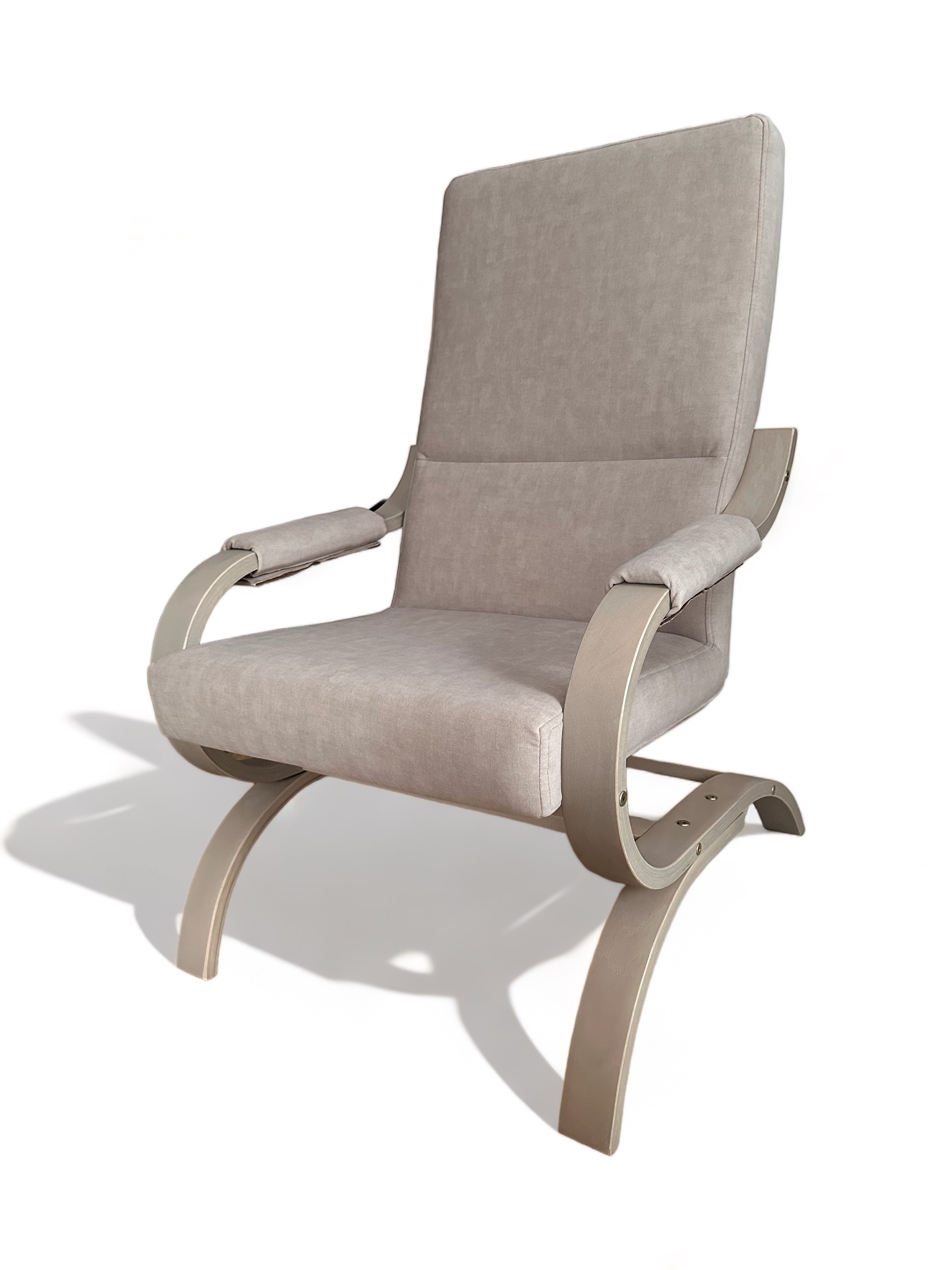 Fotel charakteryzuje się nowoczesnym i ergonomicznym designem, który zapewnia wygodę i elegancki wygląd. Tapicerka w odcieniu jasnej szarości nadaje mu neutralny i uniwersalny charakter, dzięki czemu pasuje do różnych wnętrz. Wysokie oparcie zapewnia odpowiednie podparcie dla pleców, a podłokietniki wyposażone w miękkie nakładki zwiększają komfort użytkowania. Konstrukcja fotela opiera się na giętych, drewnianych nogach, które nadają mu dynamiczną formę i lekką wizualnie strukturę. Zaokrąglone kształty stelaża dodają elegancji i sprawiają, że fotel doskonale komponuje się w nowoczesnych i minimalistycznych aranżacjach.