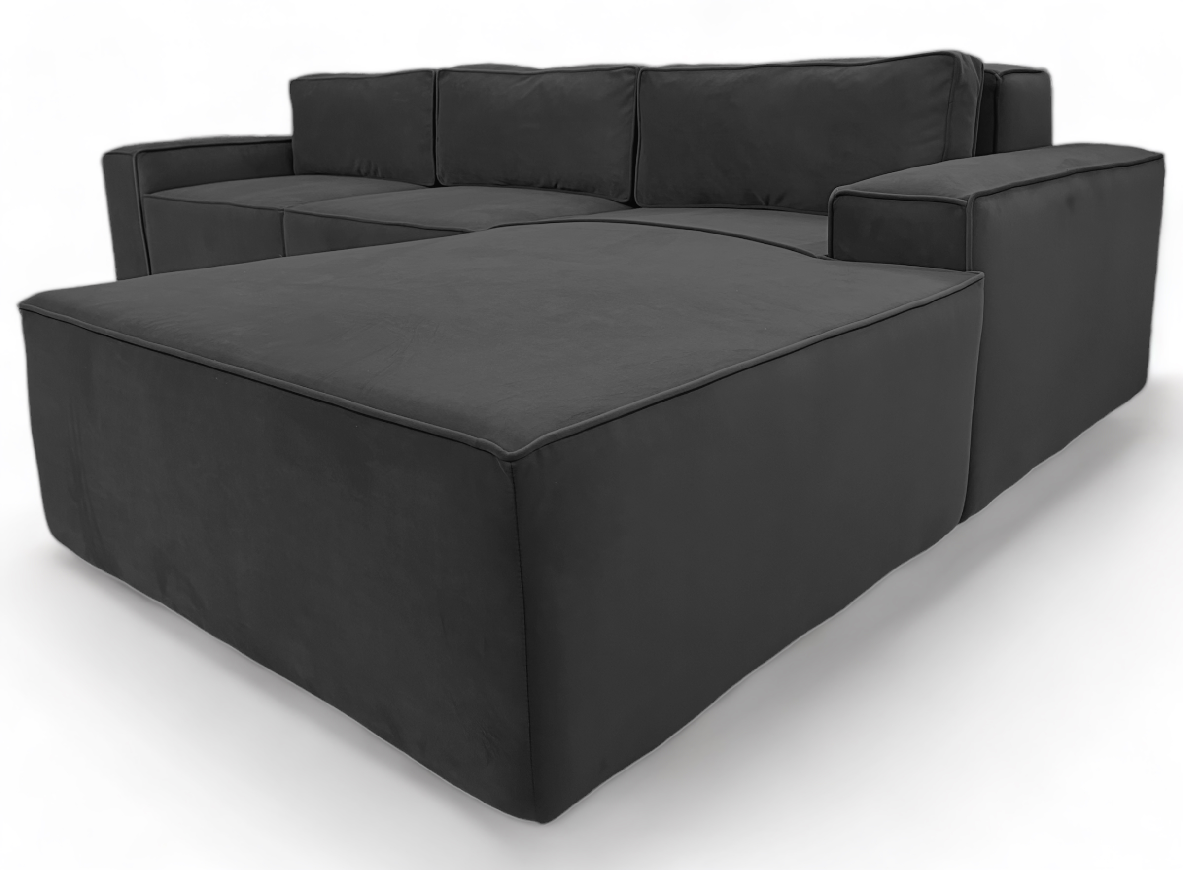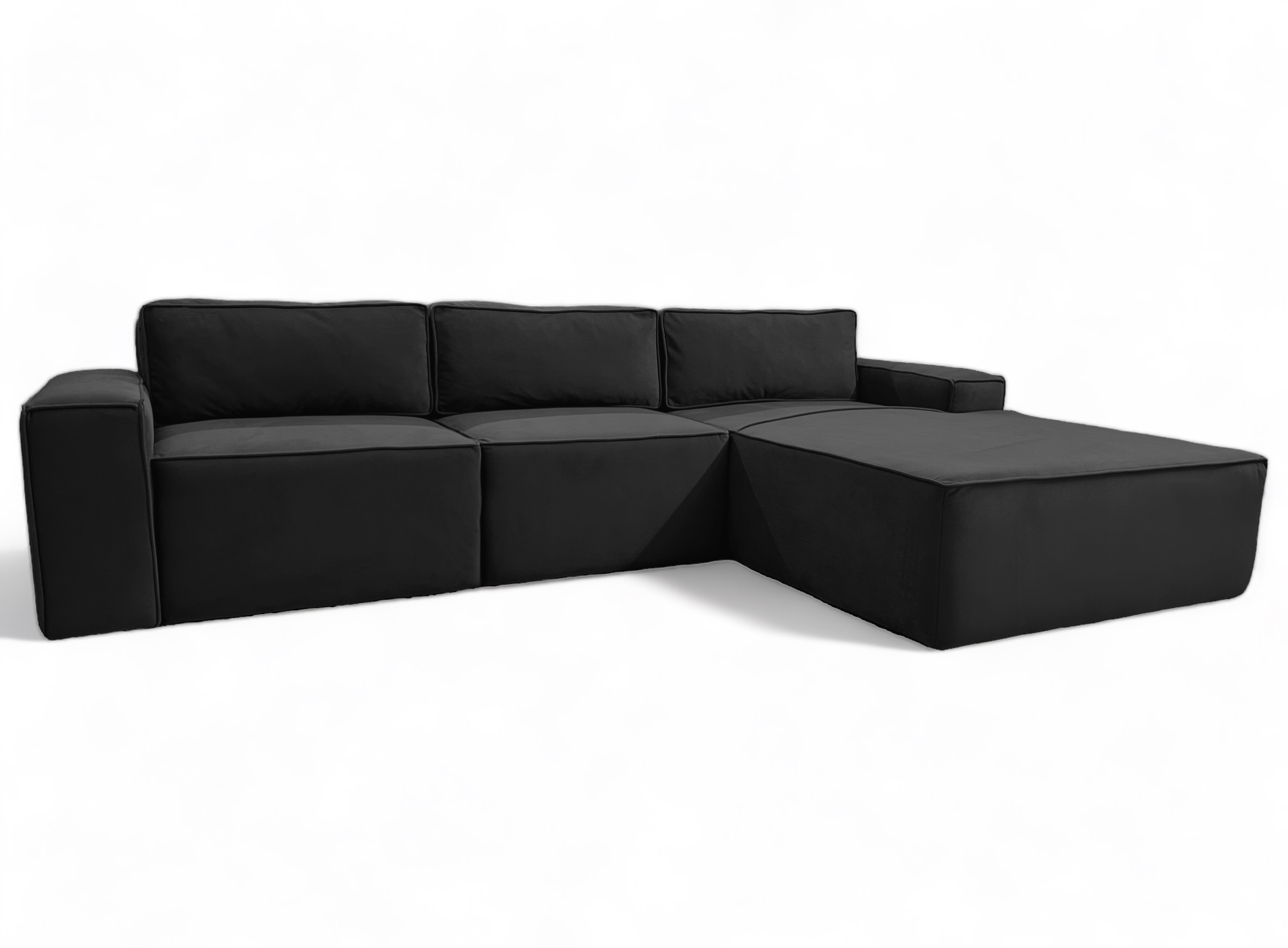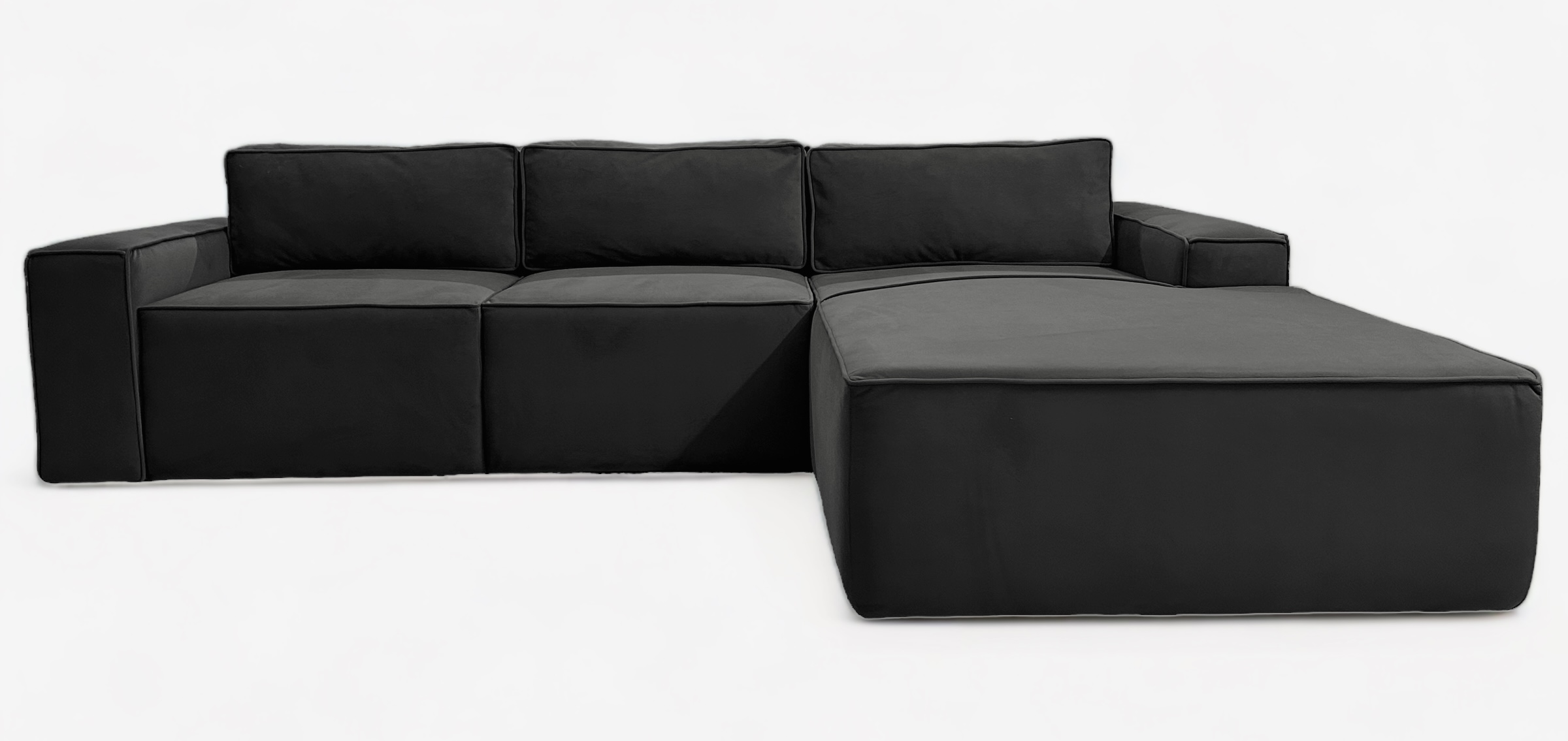 Narożnik charakteryzuje się minimalistycznym, geometrycznym designem, który doskonale wpisuje się w nowoczesne, loftowe oraz industrialne wnętrza. Tapicerowany jest w jednolitym, głębokim odcieniu czerni, co nadaje mu elegancji i uniwersalnego charakteru. Konstrukcja mebla opiera się na dużych, prostokątnych modułach o gładkiej powierzchni, co podkreśla jego surową, ale jednocześnie luksusową estetykę. Siedzisko jest szerokie i głębokie, a obszerne poduszki oparciowe zapewniają wysoki komfort użytkowania. Niskie, szerokie podłokietniki dodają narożnikowi nowoczesnego wyglądu i funkcjonalności. Duży szezlong po prawej stronie sprawia, że mebel idealnie nadaje się do relaksu, oferując dużo przestrzeni do wypoczynku. Dzięki swojej modułowej konstrukcji narożnik świetnie sprawdzi się w przestronnych salonach, nadając im nowoczesny i stylowy charakter.