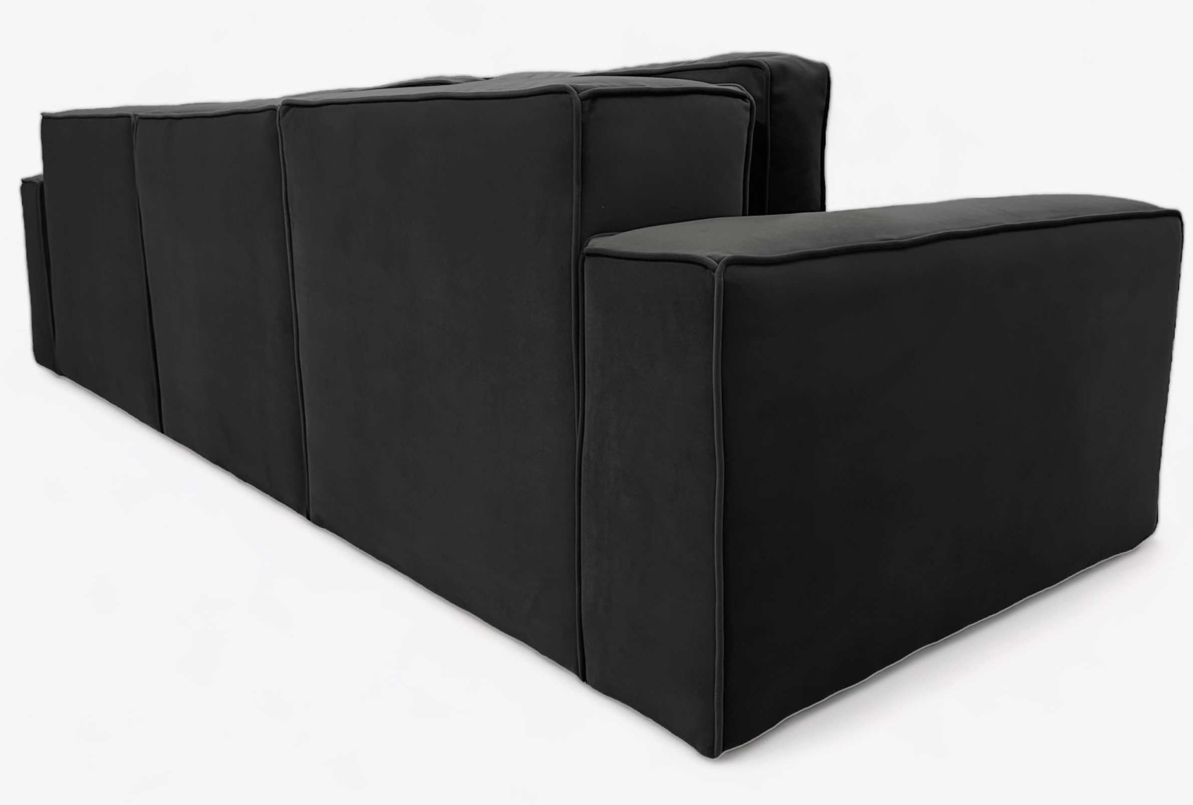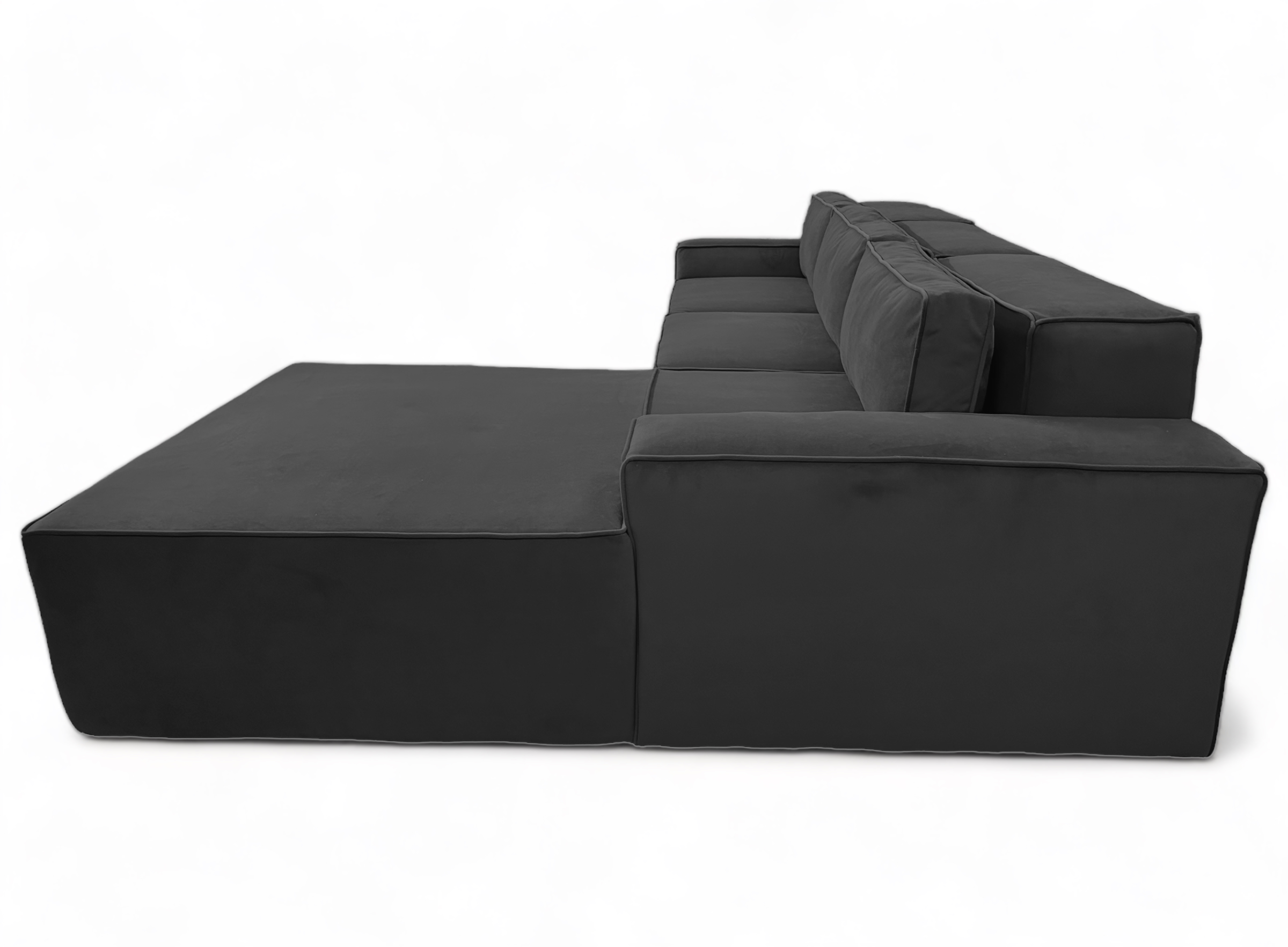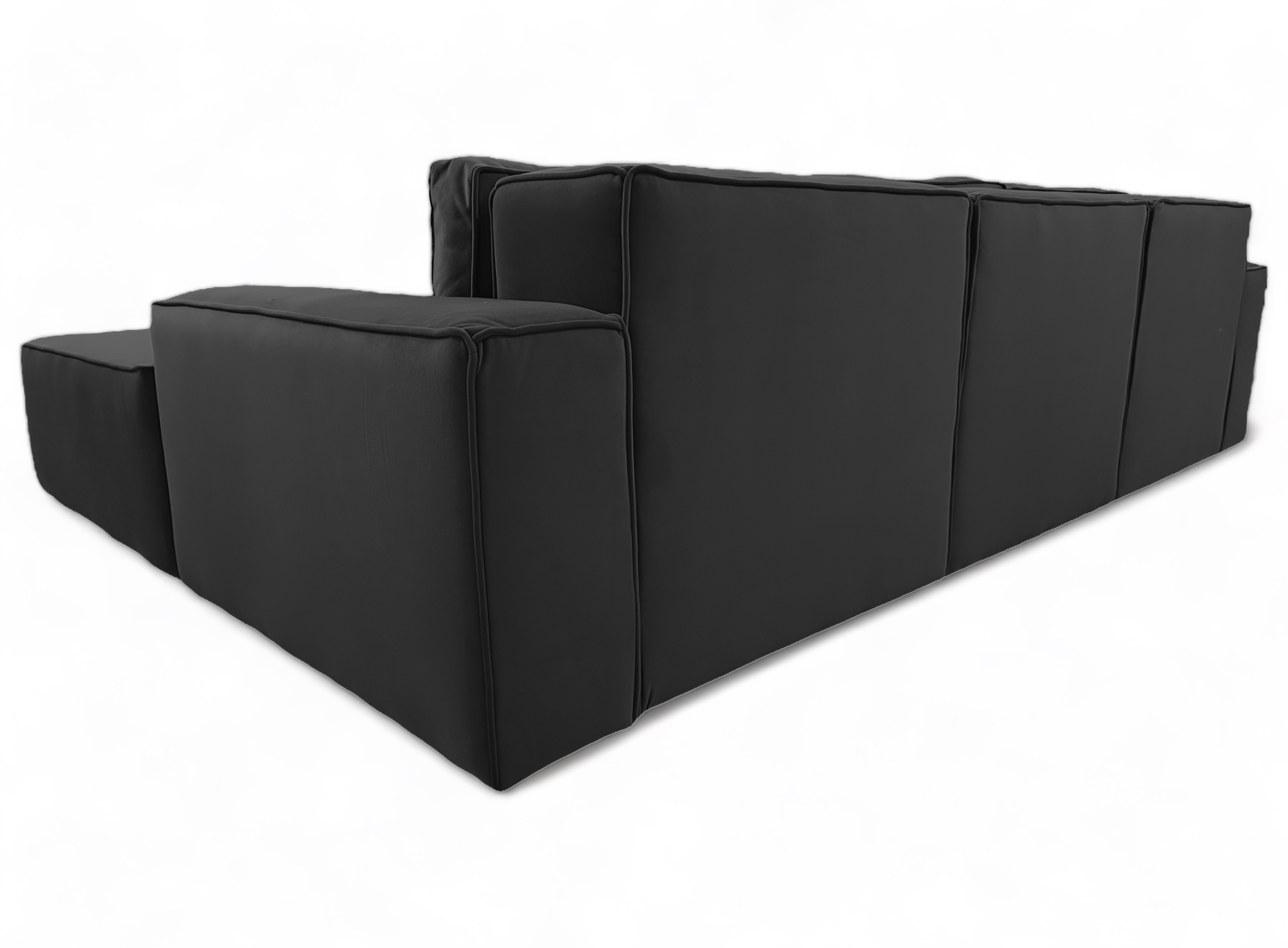 Narożnik charakteryzuje się minimalistycznym, geometrycznym designem, który doskonale wpisuje się w nowoczesne, loftowe oraz industrialne wnętrza. Tapicerowany jest w jednolitym, głębokim odcieniu czerni, co nadaje mu elegancji i uniwersalnego charakteru. Konstrukcja mebla opiera się na dużych, prostokątnych modułach o gładkiej powierzchni, co podkreśla jego surową, ale jednocześnie luksusową estetykę. Siedzisko jest szerokie i głębokie, a obszerne poduszki oparciowe zapewniają wysoki komfort użytkowania. Niskie, szerokie podłokietniki dodają narożnikowi nowoczesnego wyglądu i funkcjonalności. Duży szezlong po prawej stronie sprawia, że mebel idealnie nadaje się do relaksu, oferując dużo przestrzeni do wypoczynku. Dzięki swojej modułowej konstrukcji narożnik świetnie sprawdzi się w przestronnych salonach, nadając im nowoczesny i stylowy charakter.